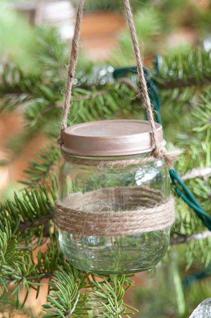 For the jar ornaments, I spray painted the lids, and then used jute twine and hot glue to decorate the jars. Next year I'd like to gather mini pine cones to put in some of the jars, and maybe do something with glitter or shredded sheet music. But this year I kept it pretty minimal.